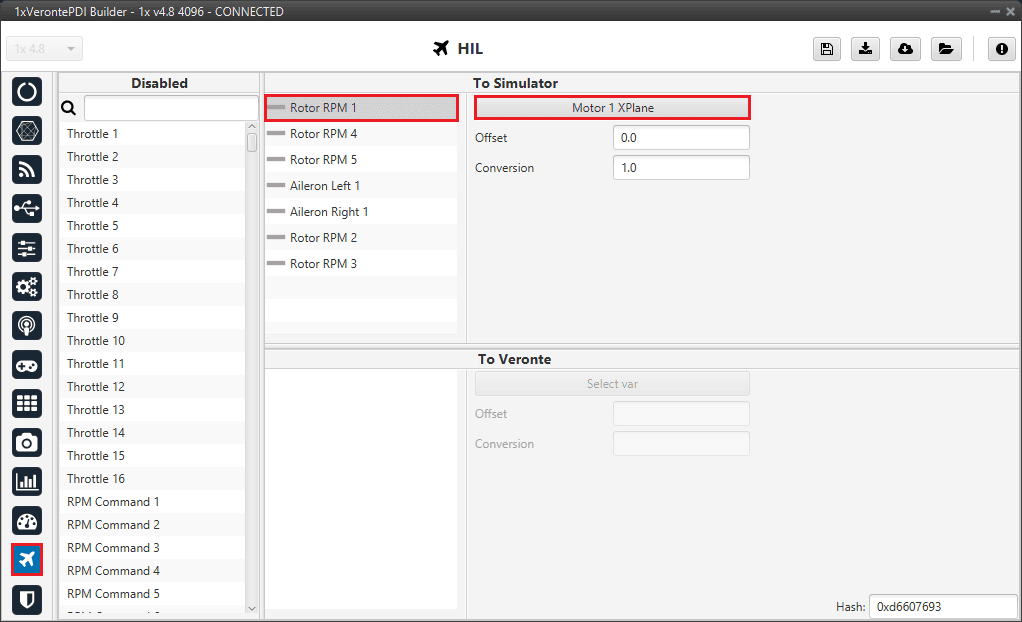 HIL Simulator is the Veronte application that allows Veronte Autopilot 1x to communicate with a simulator acting as a "bridge" between both. Therefore, users must configure this menu to simulate the performance of the Embention VTOL aircraft 1x in the selected simulator, in this case X-Plane11 has been chosen. For more information, please visit HIL Simulator user manual.