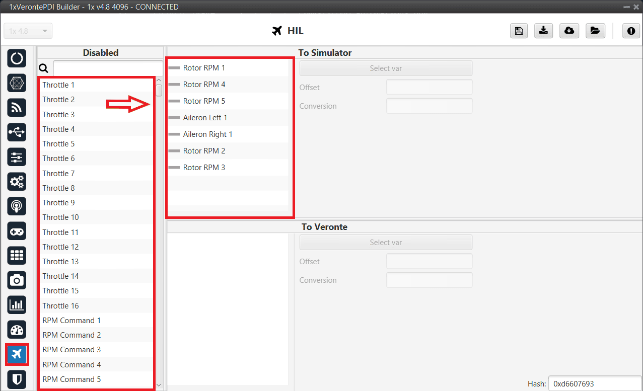 Once found, drag and drop each of them into the To Simulator panel. In this panel users can see all the variables selected to be sent to the simulator.