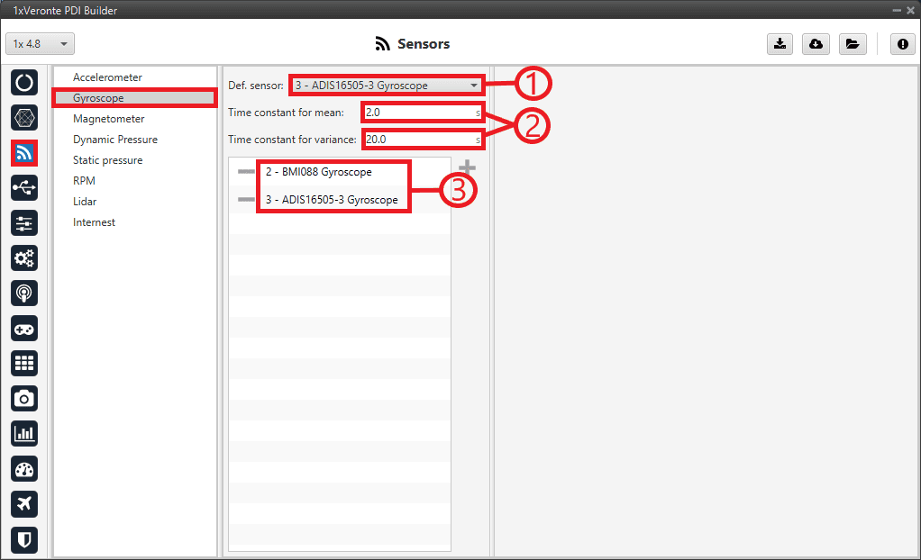 For a detailed explanation of the available gyroscope sensors, please visit the Gyroscope - Sensors section of the 1x PDI Builder user manual.