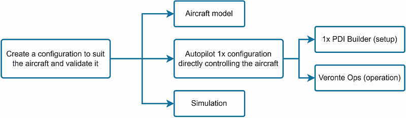This section explains the main steps to be followed to create a new PDI configuration that adapts the Veronte Autopilot 1x performance to the aircraft and mission requirements. The process followed from the creation of a configuration until it is operated in flight with Veronte Autopilot 1x is divided into 2 phases: