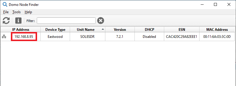 Open Domo Node Finder and the connected radios will appear here as SOL8SDR.