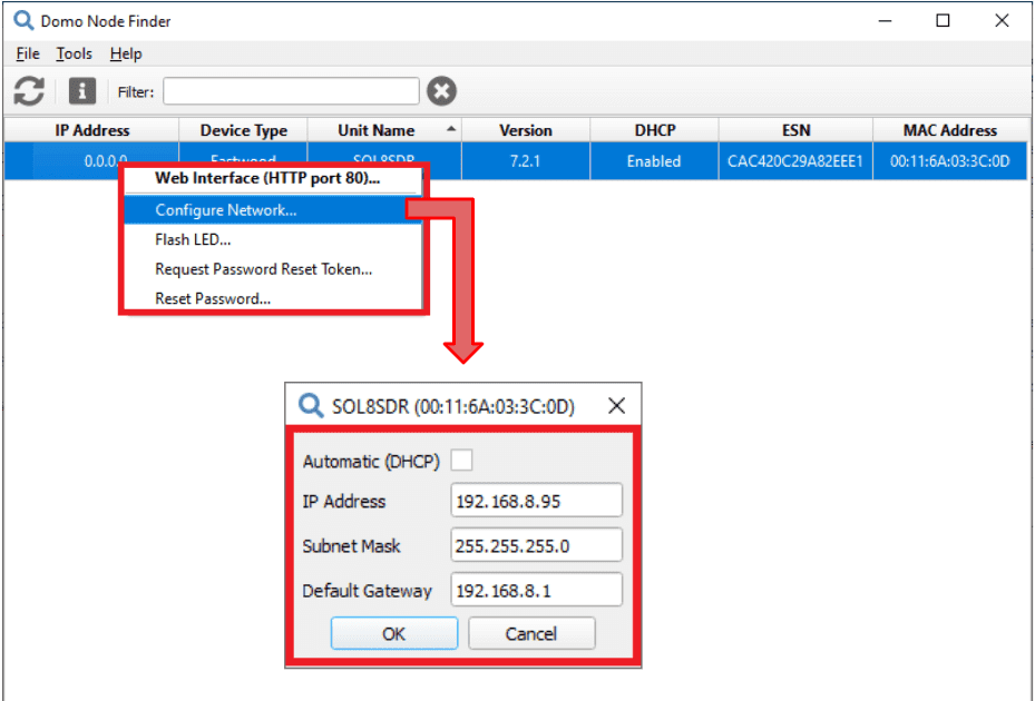 Domo Node Finder - IP address configuration To confirm the change, click the