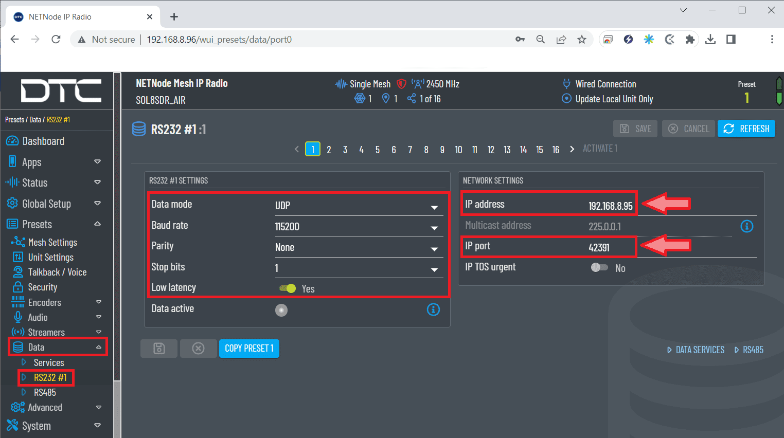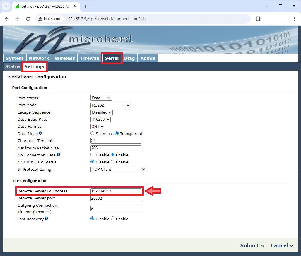 - Peer IP: This should be the IP address of the radio on the other end of the RS-232. In this example, we must set the IP address of the radio linked to the ground unit.