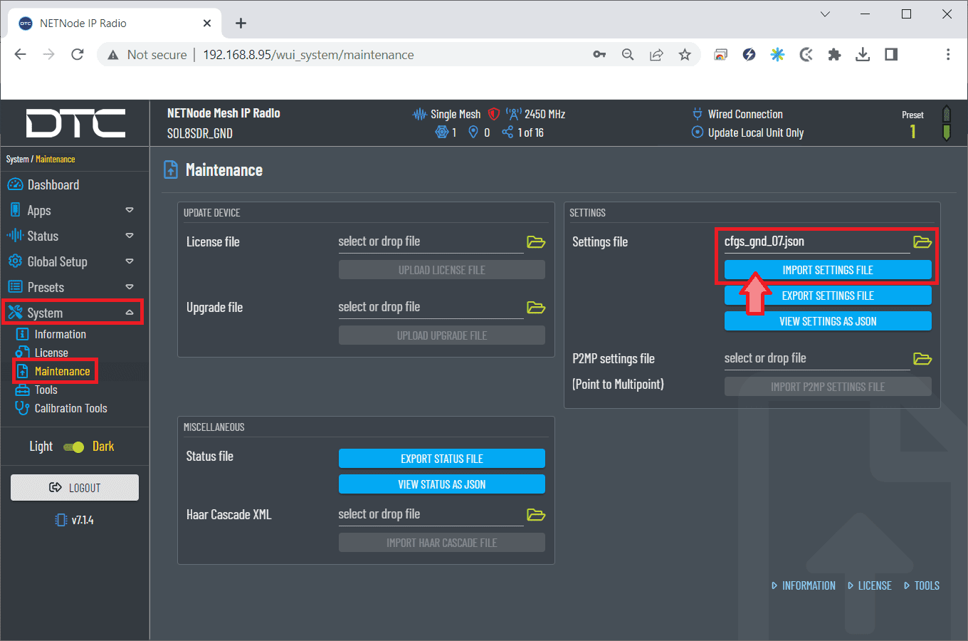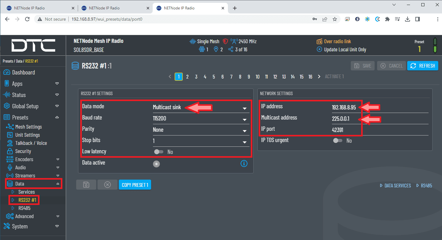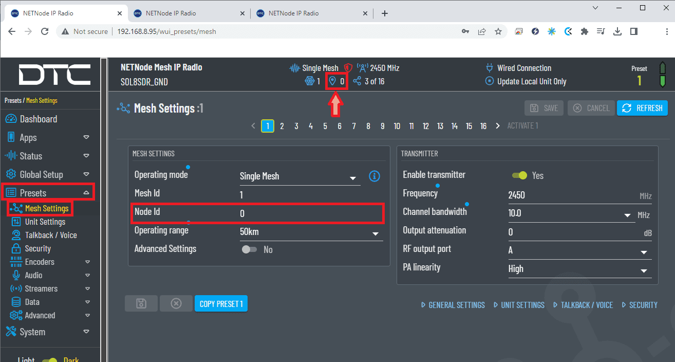 Once the website has been accessed, follow the steps below which show the parameters that need to be modified for correct operation and pairing of the radios.