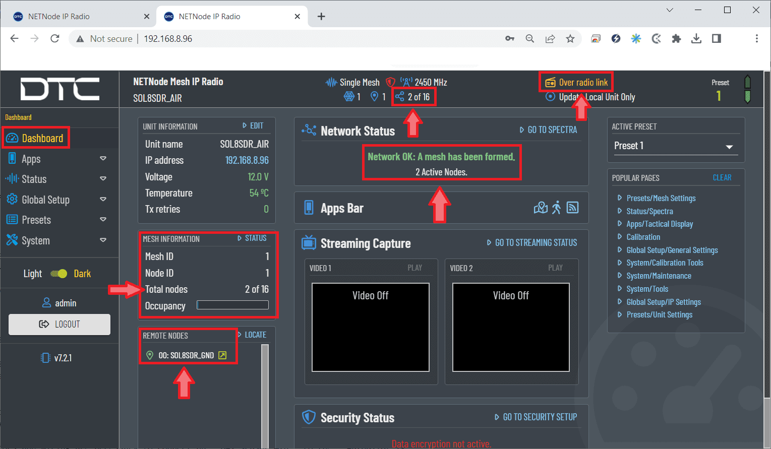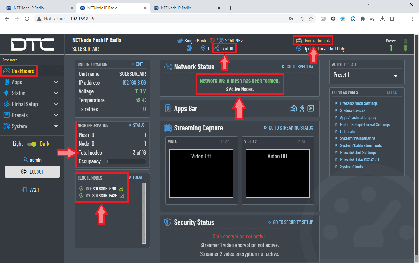 After configuring both radios with these settings they should be paired. Therefore, if we connect them to the power supply, when we switch them on, the LED will turn from fix red to fix green, this indicates that it is connected to at least one radio. Also, if we connect only one of them to the computer, we can access the StreamScape GUI of both.