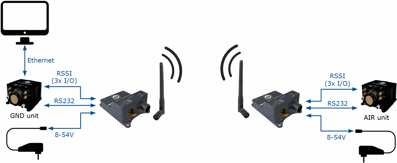 This section shows how to connect and configure a SDL (any variant) with an Autopilot 1x air unit and an Autopilot 1x ground unit. The following diagram summarizes the flight communication system between a 1x ground unit and a 1x air unit installed on an aircraft.