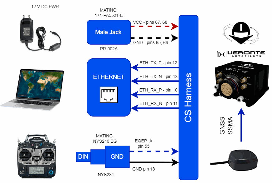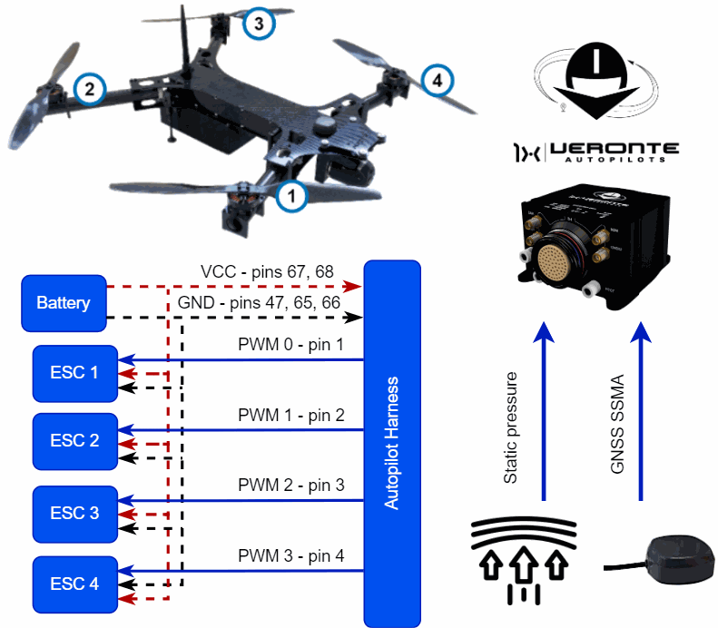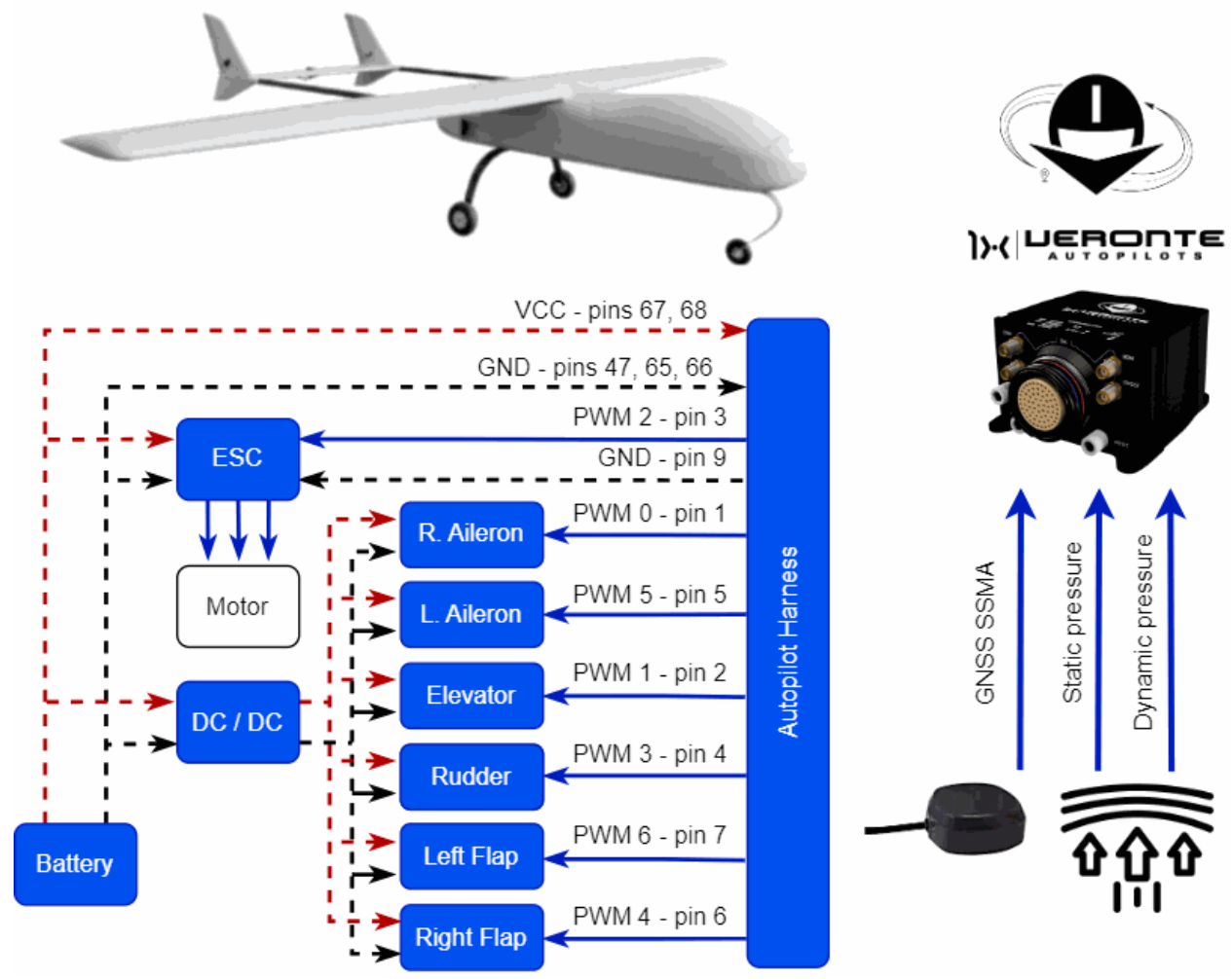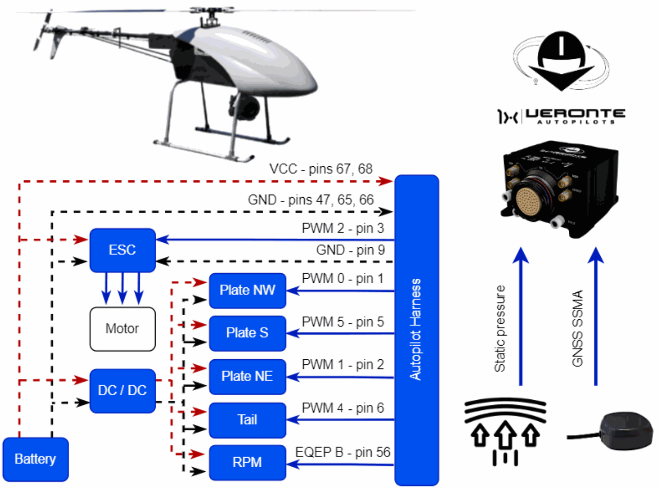 Veronte Autopilot 1x equipment harnesses have specific pin layouts. Only use their own matting connectors, do NOT mix harnesses: misuse can lead to destruction.