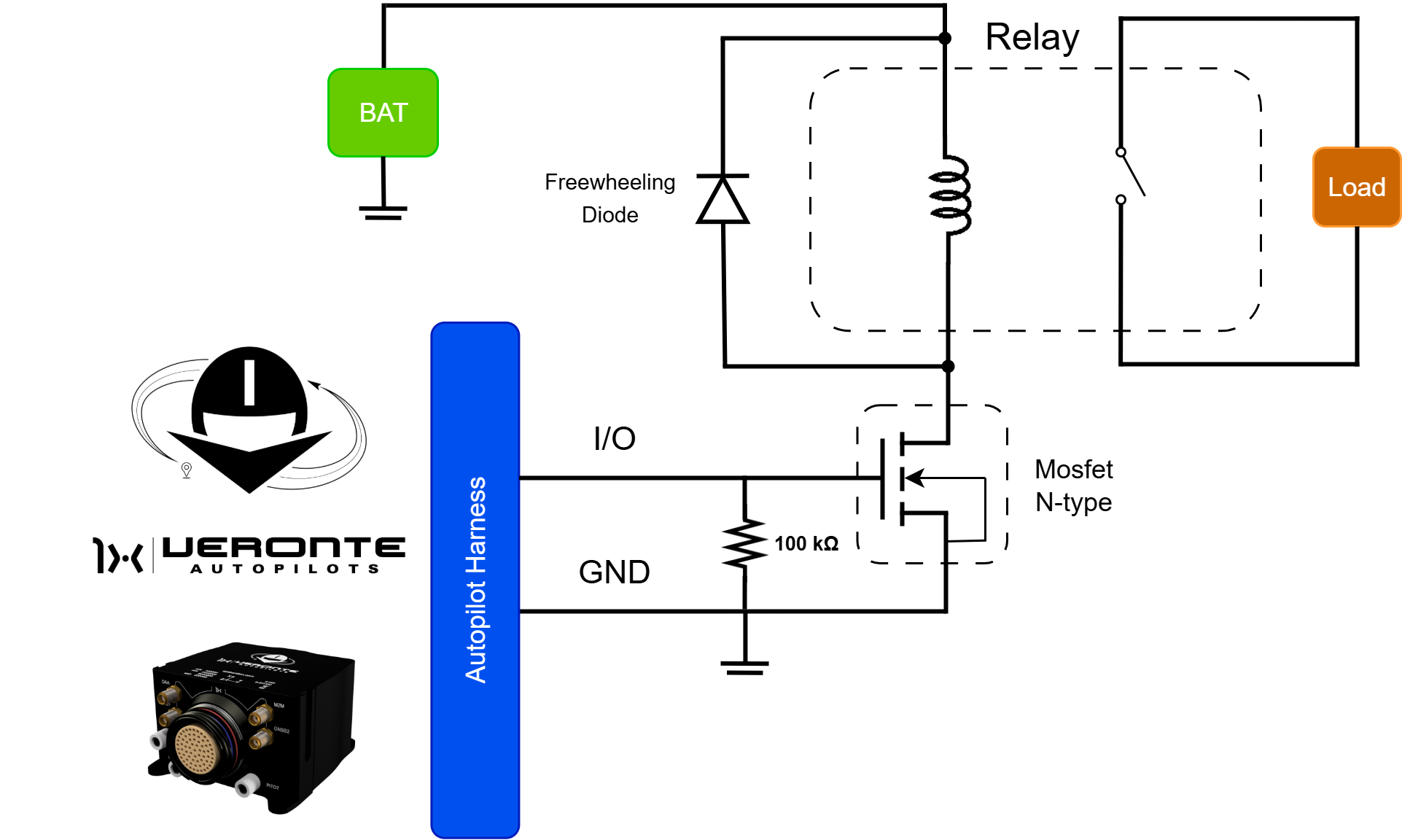 Due to this current limitation, an intermediate circuit is required to handle higher-power loads. The solution recommended is to use an N-type MOSFET as an electronic switch. The following diagram shows the recommended circuit for driving a relay: