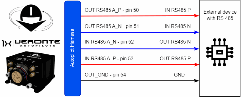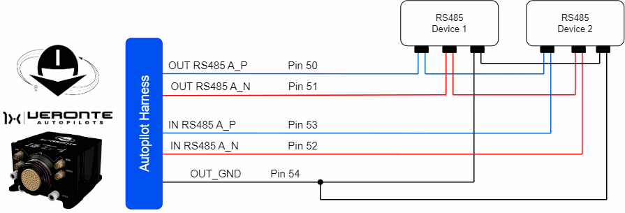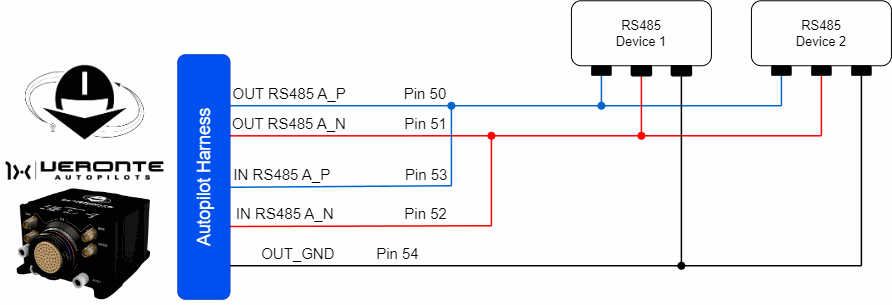 The user has the option to configure either of the two available RS-485 lines on the Autopilot 1x: RS 485 A or RS 485 B. For more information about these pins, refer to the Pinout - Hardware Installation section of the present manual.