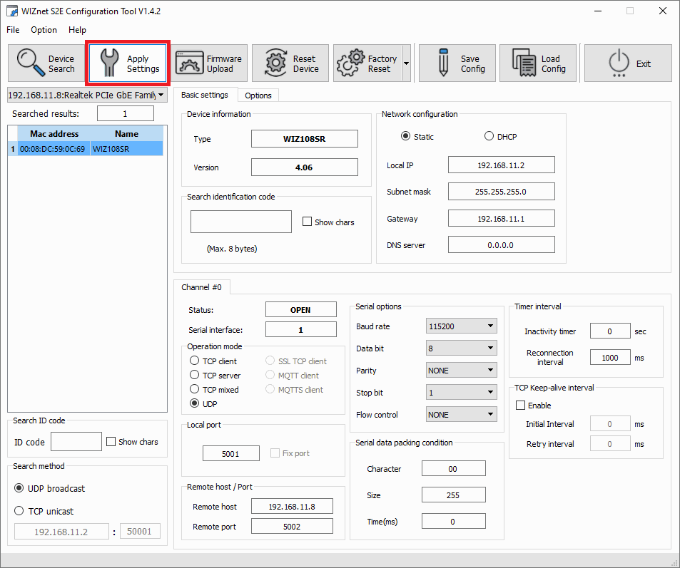 WIZnet software - Apply Settings