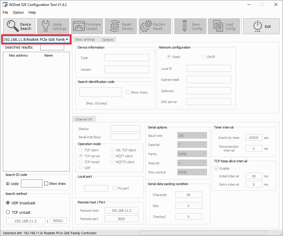 WIZnet software - Ethernet port selected