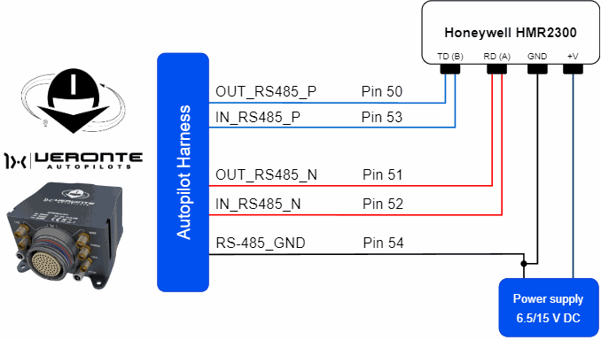 For proper operation via RS485, the connection between Magnetometer Honeywell HMR2300 and Autopilot 1x pins should be like this: