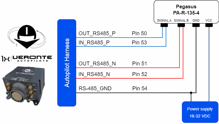 The following wiring connection is recommended for a RS485 half-duplex connection between Volz DA26 servos and Veronte Autopilot 1x: