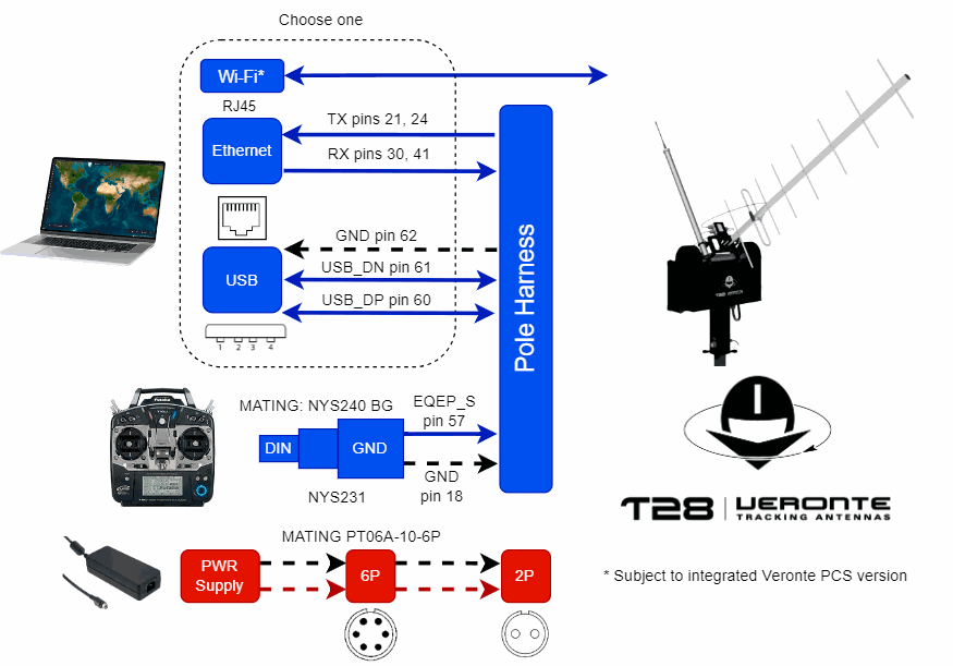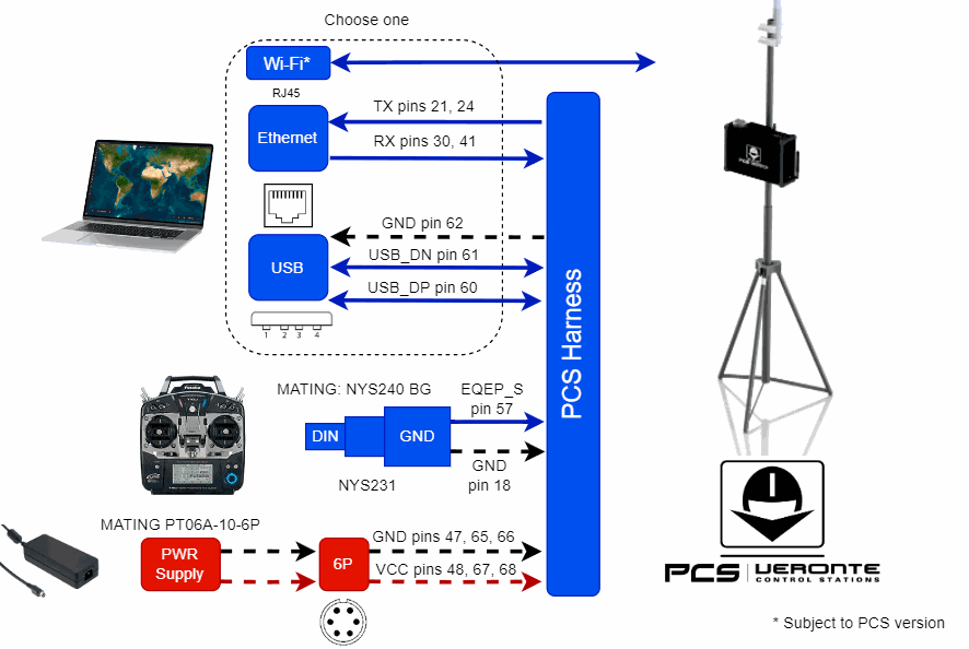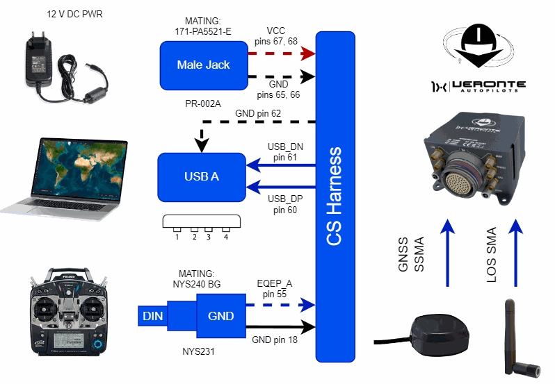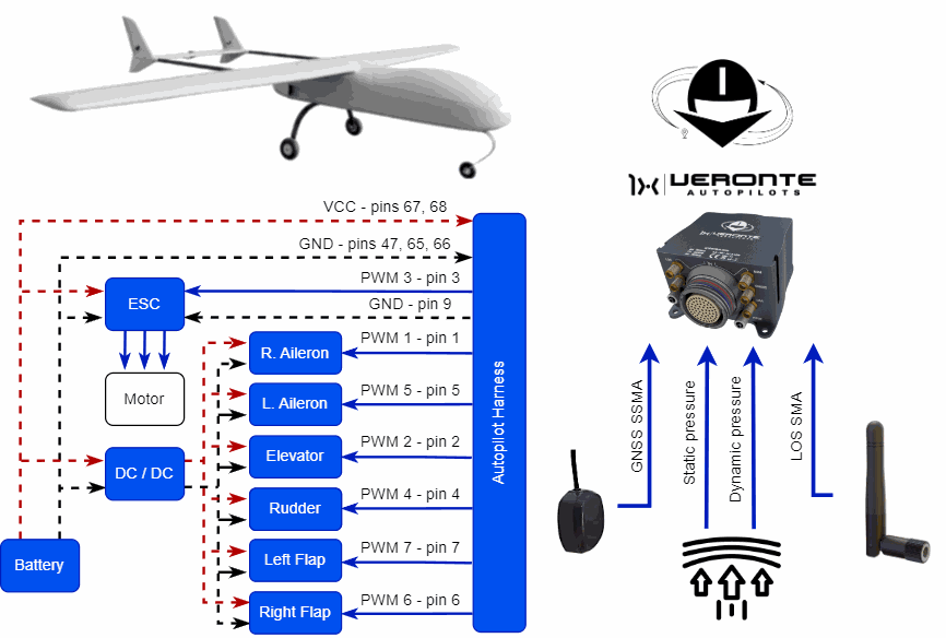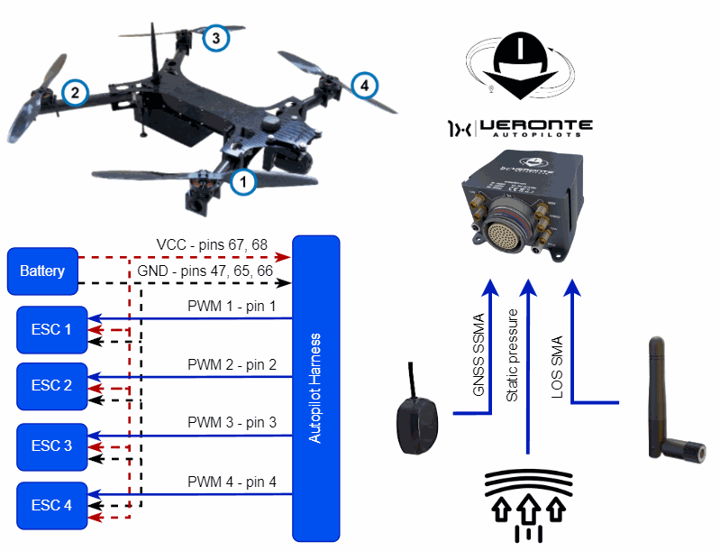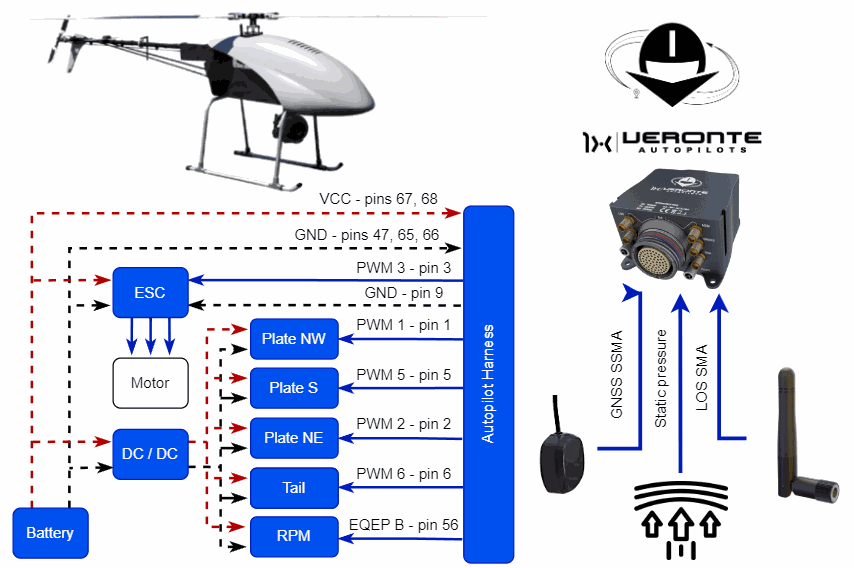 Veronte Autopilot 1x equipment harnesses have specific pin layouts. Only use their own matting connectors, do NOT mix harnesses: misuse can lead to destruction.