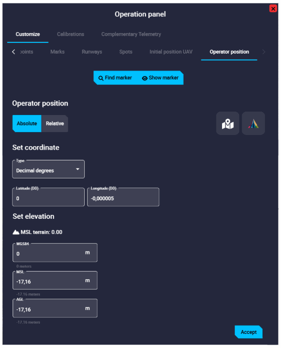 From Veronte Ops app, users can select an Operator Position, which is the reference point from which the distance allowed by the operating license is calculated (in this case 500 m radius).