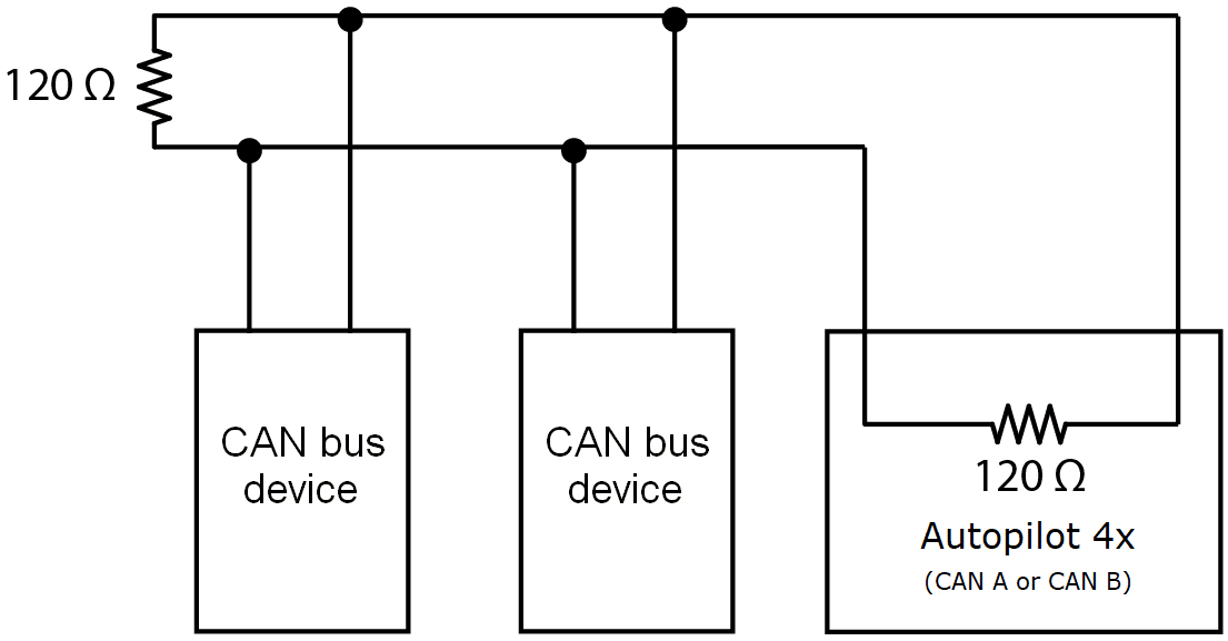 Autopilot 4x requires two termination resistors (120 ) to allow multiple CAN Bus devices to be connected to the same line.