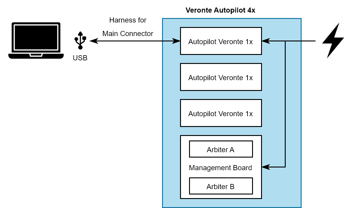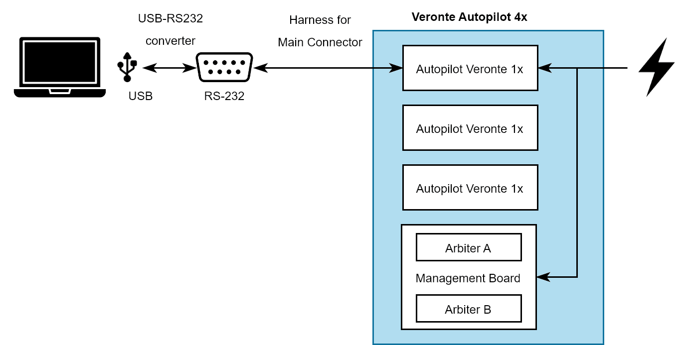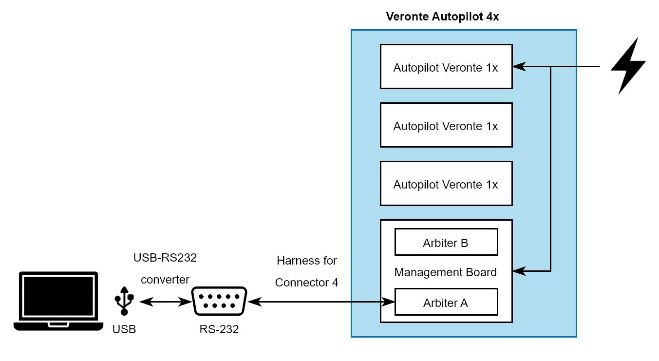 There are two ways to connect a Veronte Autopilot 1x to a computer: USB or serial with RS-232. Both options require power supply for the connected Autopilot 1x. Attach the 4x Redundant Harness to the Connector 4 to connect a computer and any Autopilot 1x.