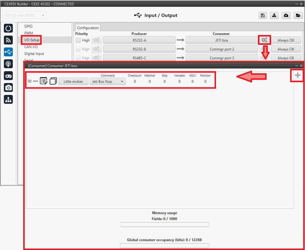 Configure the Jetibox IO consumer to retrieve the data. Click on the configuration button