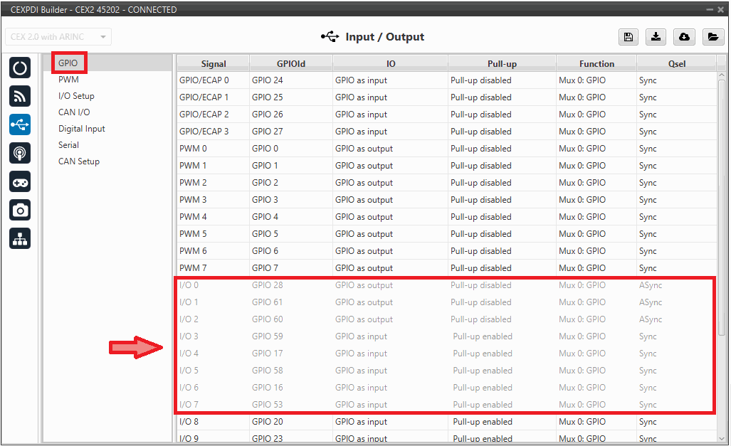 Finally, upload the newly exported configuration to the CEX unit and check that the GPIO panel is correctly configured.