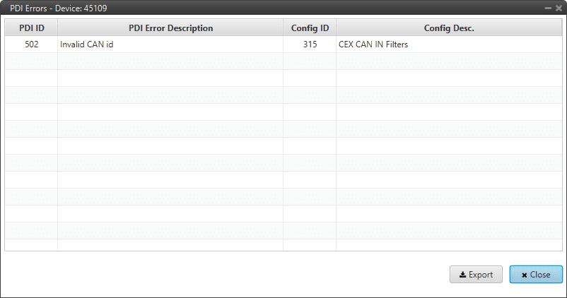Clicking the Export button will export a .csv file with the same information shown in this PDI Errors panel.