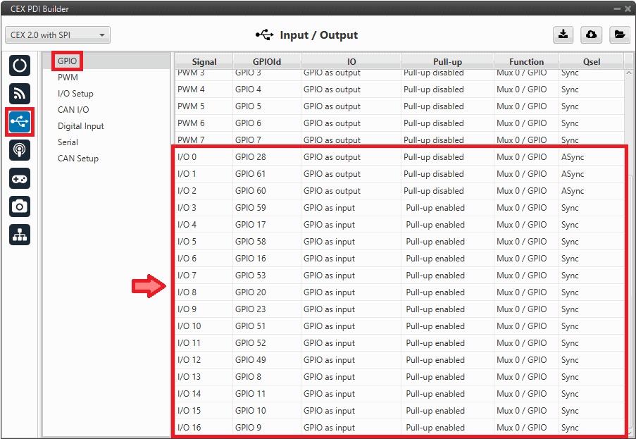 CEX 2.0 with SPIto be able to change the GPIOs configuration of the GPIO panel.