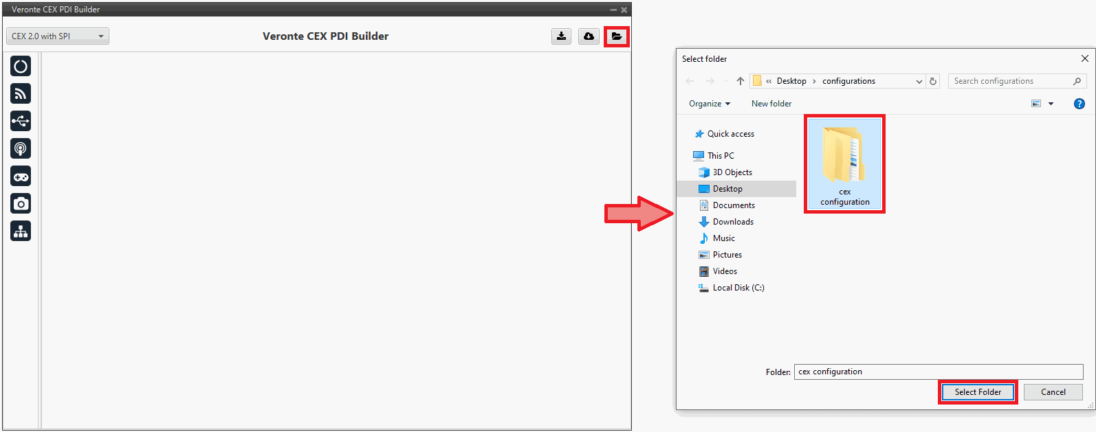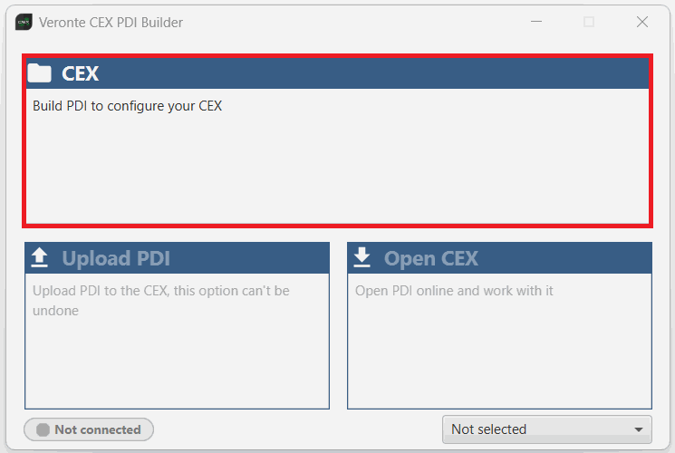 Open a configuration in CEX PDI Builder in offline mode by clicking on CEX option in the first window of the application: