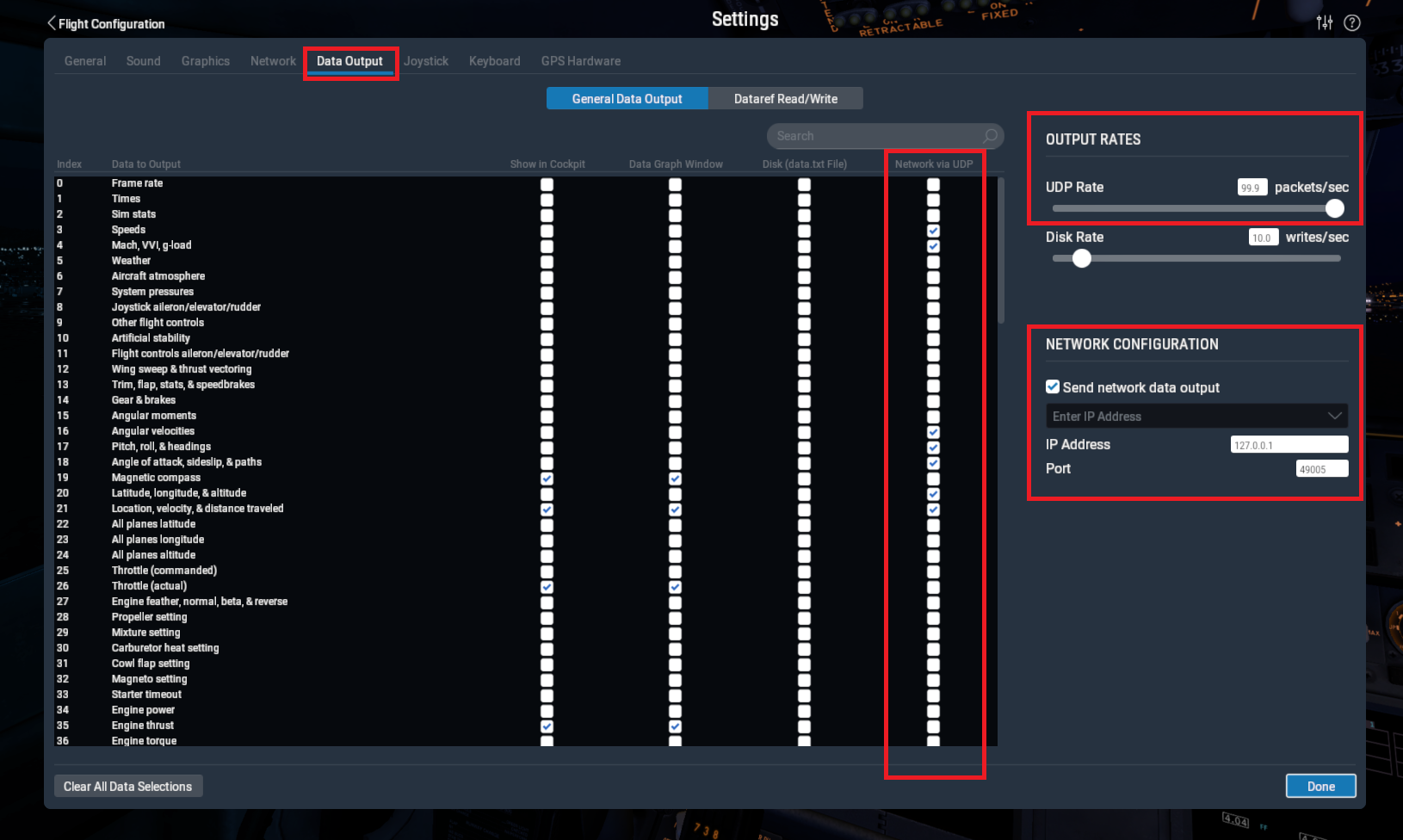 Select all the variables to sent through the UDP Network and set the UDP rate at maximum speed. The network configuration must be configured as shown in the following table and picture.