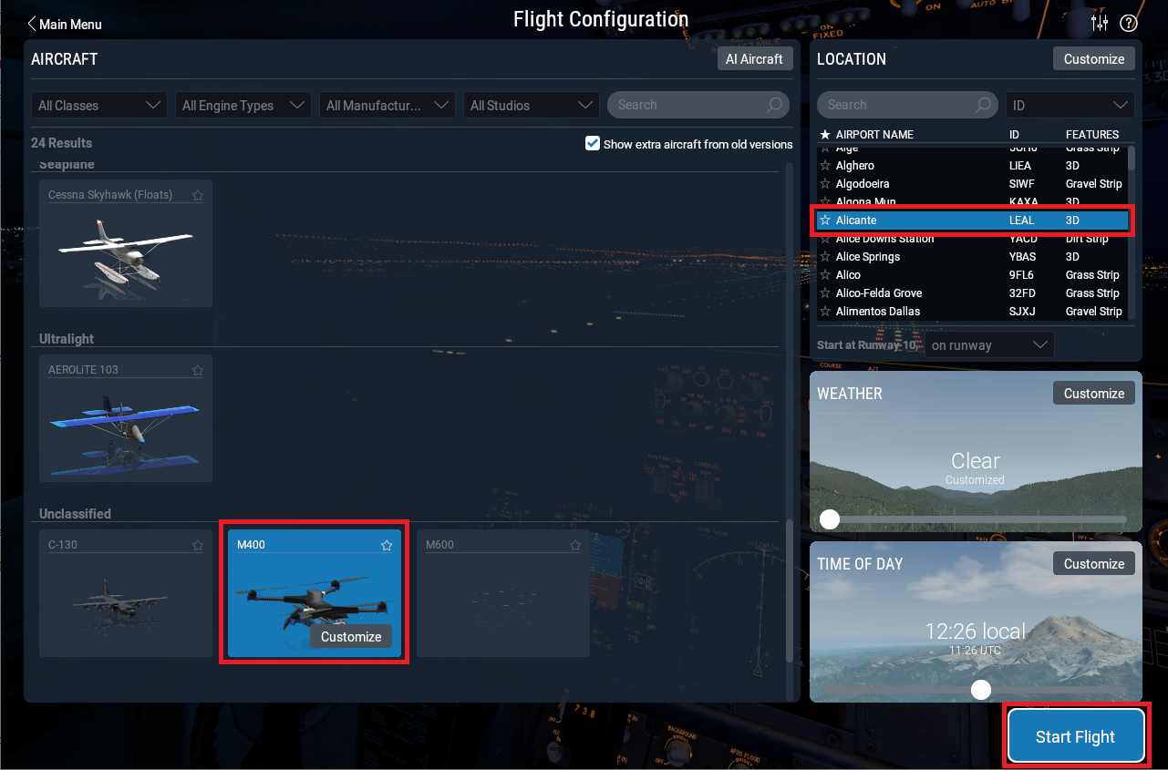 Select which aircraft to use, the starting airport and weather conditions to simulate. Then, click on Start Flight to start the simulation: