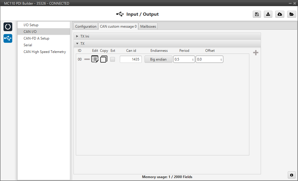 - TX Ini: Used to configure transmitted messages that are only sent once at the beginning of the operation (sent when the MC110 boots up). They can be used to initialize some devices.