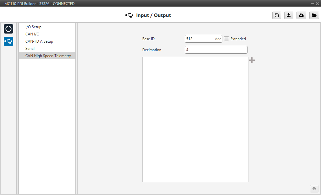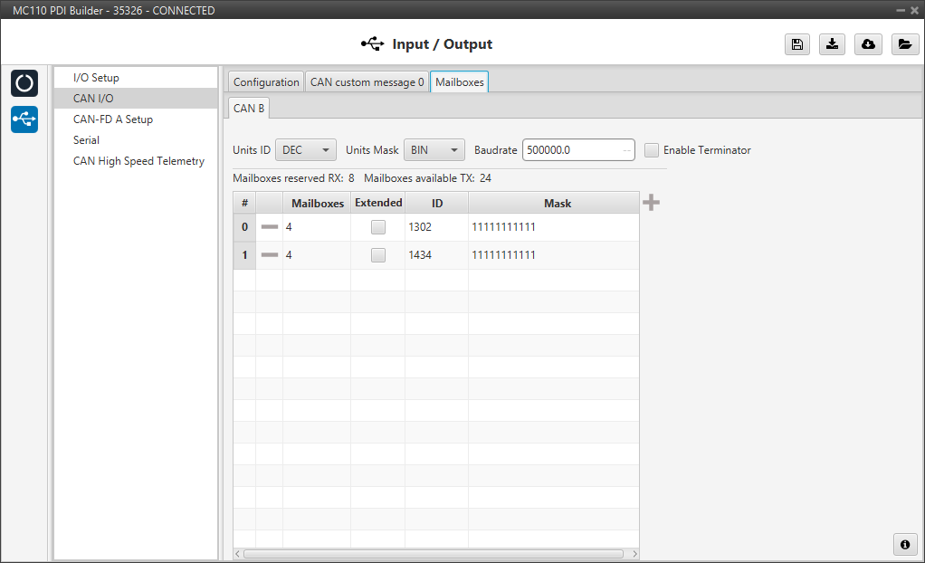 - CAN B (Classic CAN): A standard classic CAN bus. The configuration for this port, such as its Baudrate and reception Mailboxes, is managed within this CAN I/O panel.