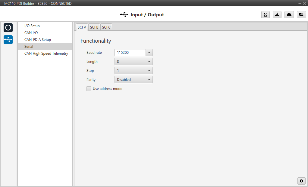 MC110 can use up to three serial peripherals (SCI A, SCI B and SCI C). Serial ports A, B and C parameters can be edited in this menu to fit the serial protocol requirements.