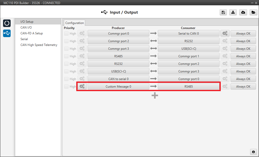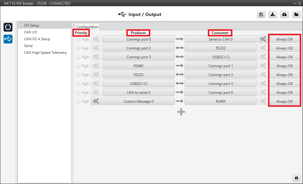 In this menu, the user can find the same 'columns' (Priority, Producer, Consumer and Bit), as well as the "Add a New Row" option, as in the I/O Setup panel.