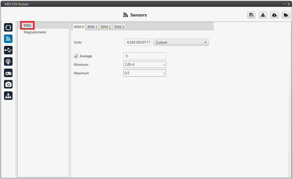 - Units: Sensor conversion factor. It can be Pulse per cycle, Radians per pulse or Custom.