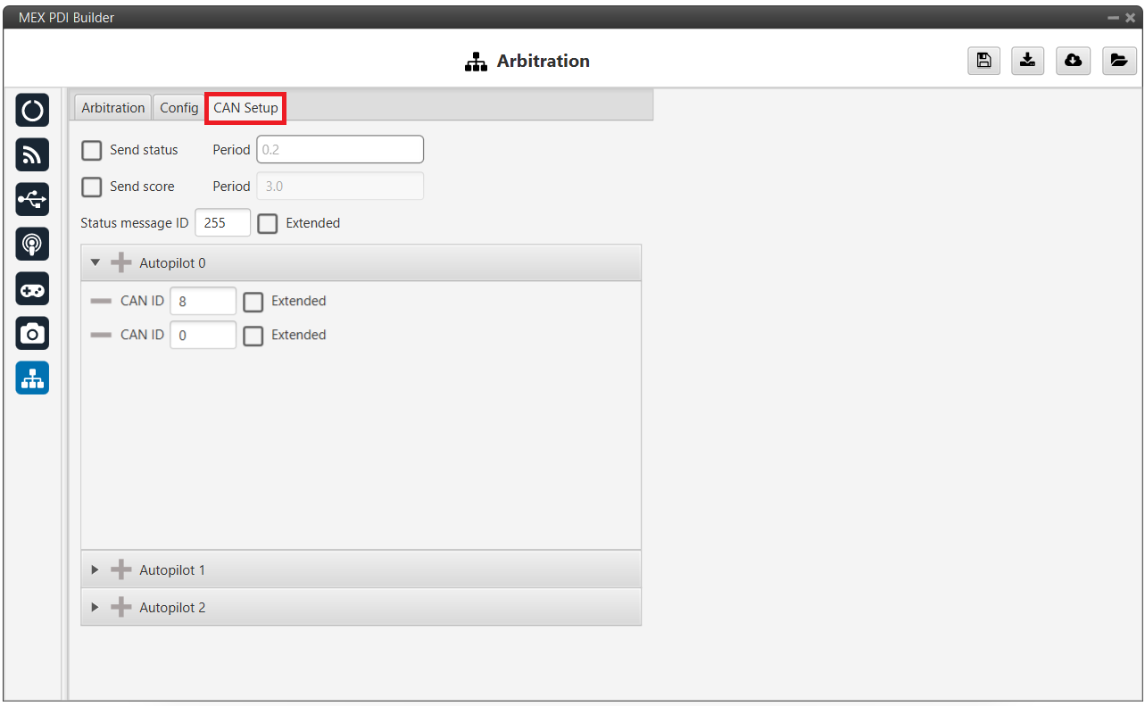 This menu allows to configure the receiving CAN Ids for each of the 3 possible Veronte Autopilots 1x that are sending data to MEX. Therefore, to send data from any of them to MEX, these Ids must be specified.