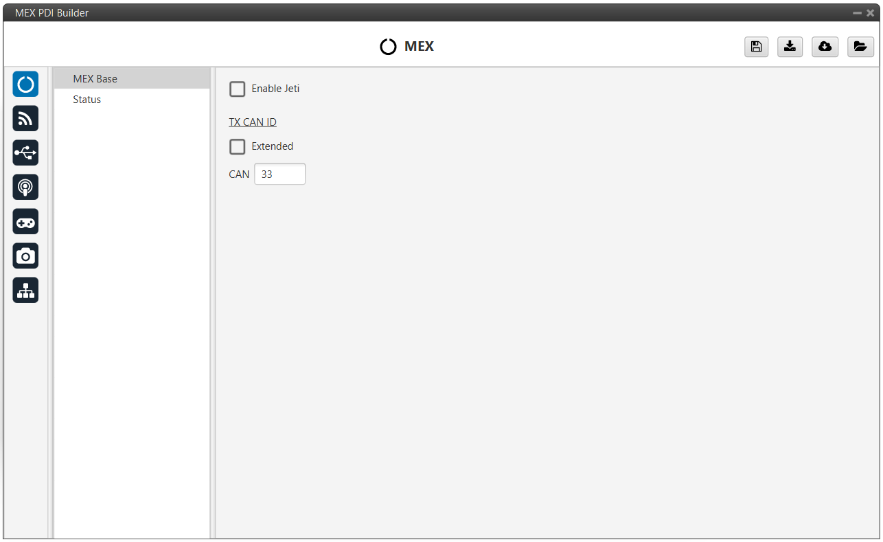 MEX is able to send information about its version and Jeti telemetry from devices connected to MEX, this is the "status message". It is possible to define the CAN Id used for those messages.
