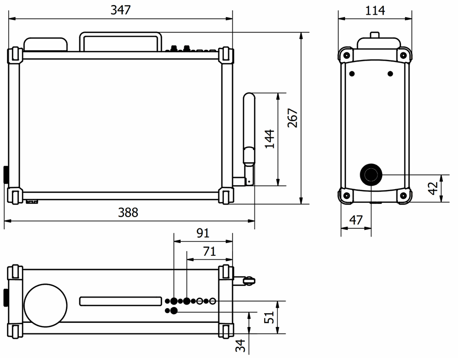 | Transport case | Rugged plastic case, quad track wheels, pressure purge valve, side handles and carry handle |