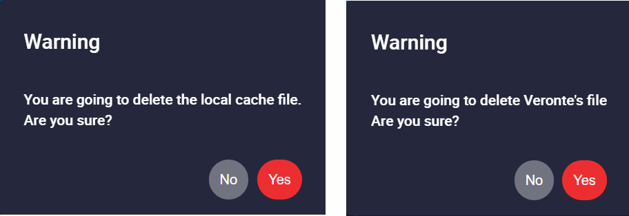 The user must confirm these actions by accepting a confirmation panel. Panels below correspond to the confirmation of the local file deletion and the autopilot file deletion respectively: