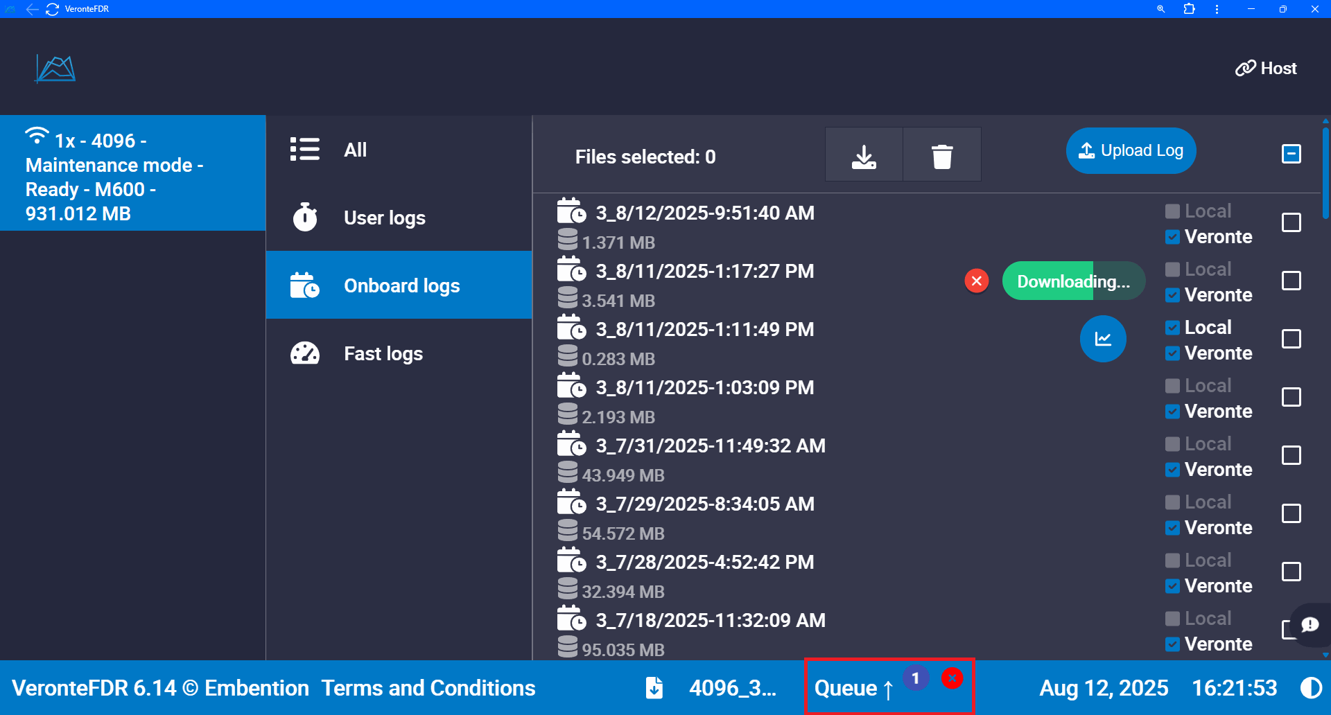 Download queue: Although it is not possible to download multiple files simultaneously, when you select multiple log files and click the download button, they will be added to a queue. The system will then download them sequentially, one after another.