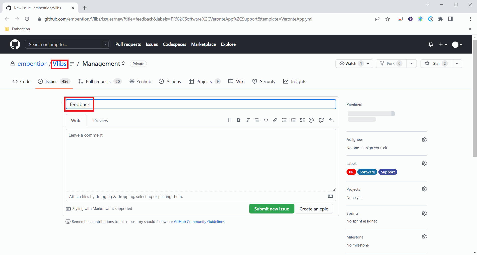 This issue is created in the repository indicated before with the title that has been defined. Find below an example of the creation of a feedback: