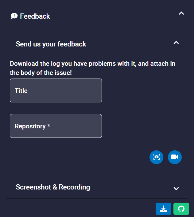 It is advisable to attach this folder when creating the issue. Finally, by clicking on the Send button, a Github window will open in the browser with an issue.
