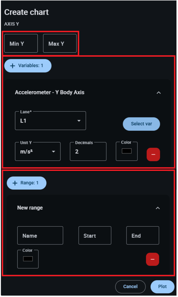 • range button: Enables the user to add different ranges to the chart, which are useful for highlighting operational limits or zones of interest.