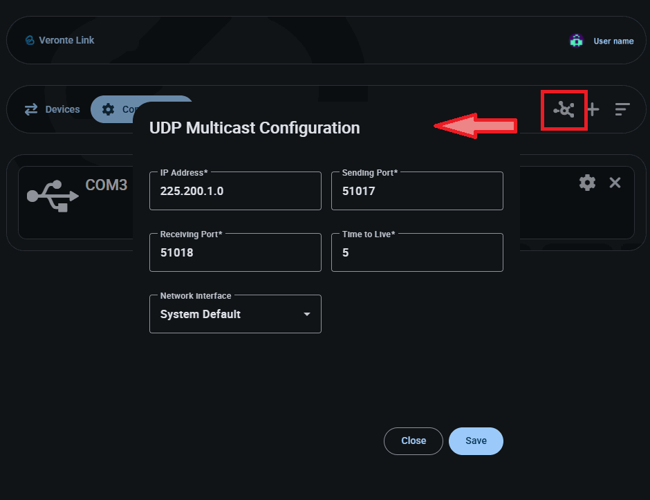 - Network interface: This setting defines the device's network adapter used by Verontelink for multicast traffic. You can choose a specific interface or let the operating system manage the routing (System default).