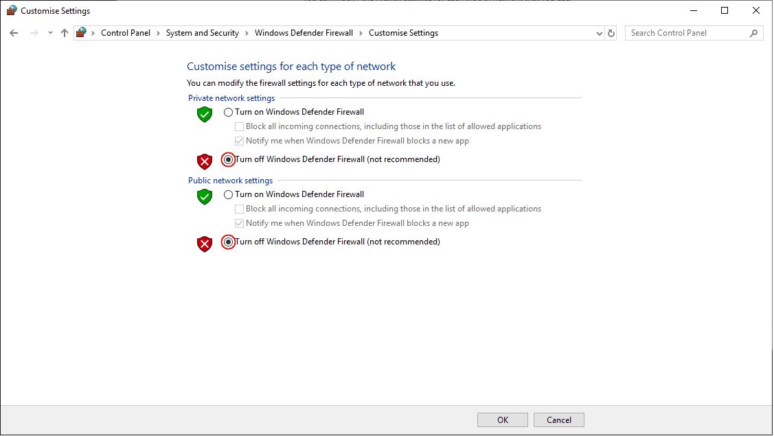 To disable the firewall, go to "Control Panel" "System and Security" "Windows Defender Firewall" and then, click on "Turn windows Defender Firewall on or off".