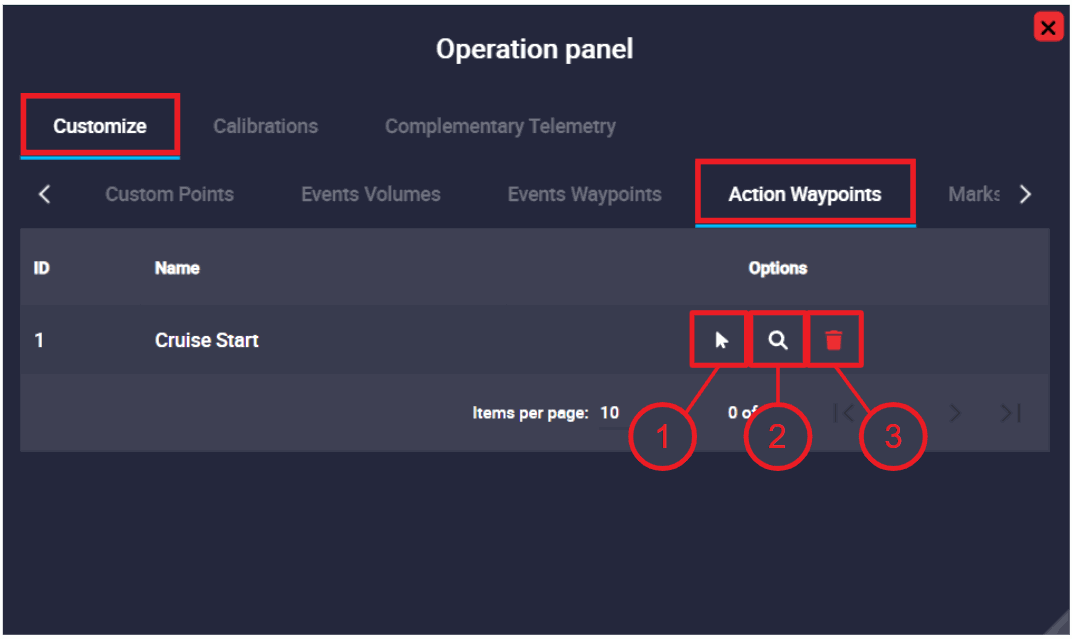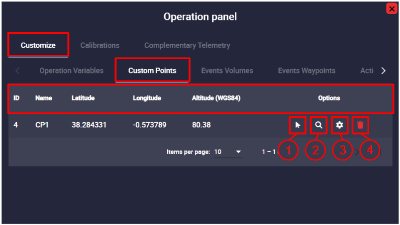 Once, the Custom point is linked to a waypoint, the following options will appear in the operation panel: