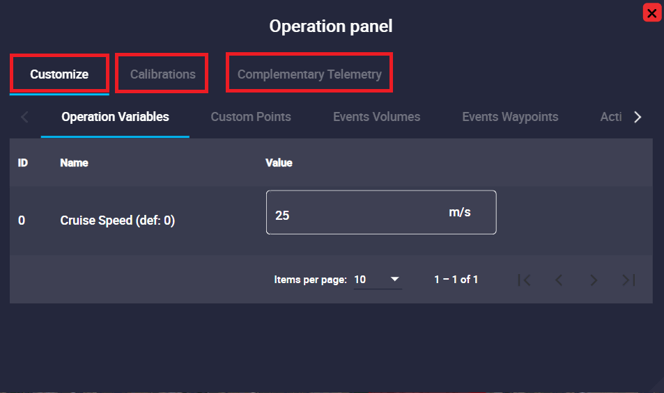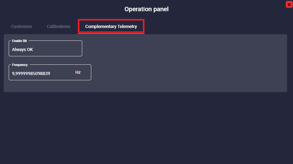 This menu is divided into 3 different functionalities: manage operation elements in the Customize tab, simple calibrations in the Calibrations tab and manage complementary parameters in the Complementary Telemetry tab.