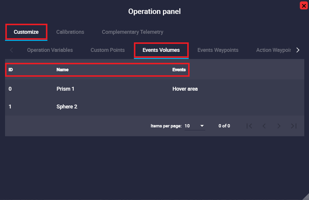 If the user wants to define cylindrical or spherical volumes, this must be done in the 1x PDI Builder software, as described at the beginning of the Customize section. Then, to associated an event with a volume, the process to follow is explained in the Shape - Mission section.