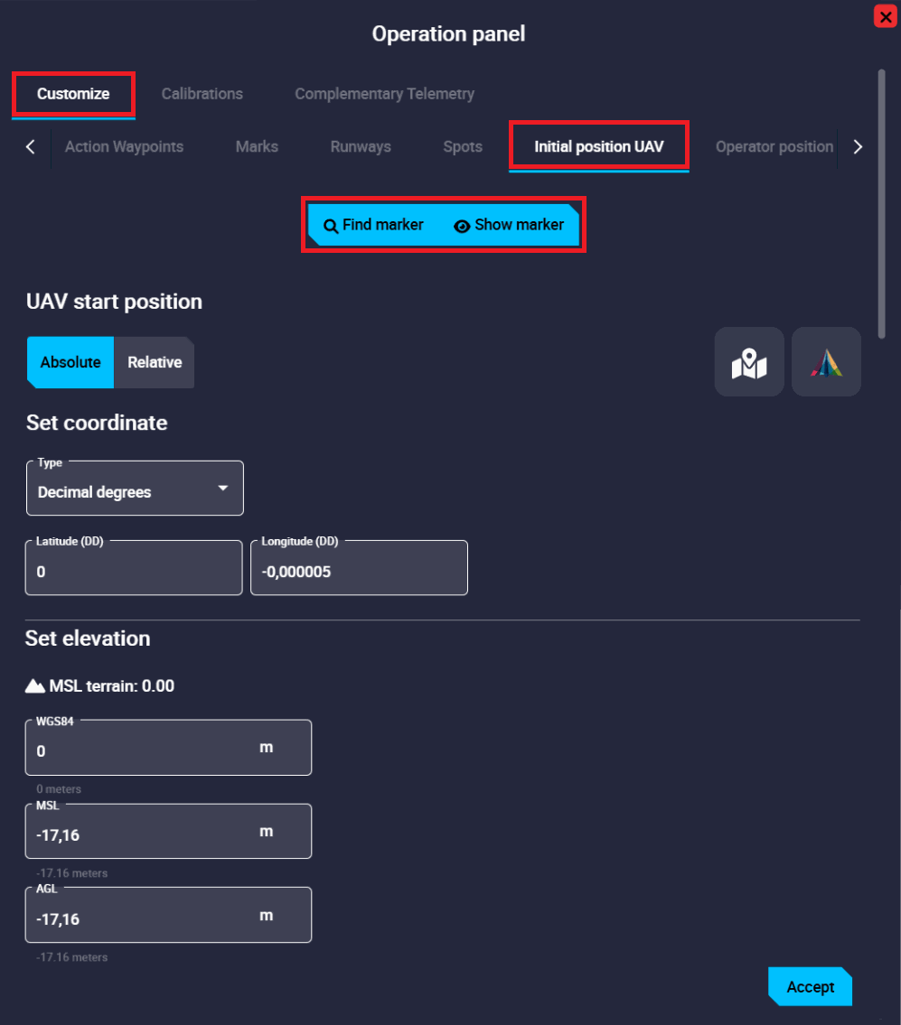 The configurable parameters of the position calibration are the same as for configuring the position of a waypoint. So they have already been described in detail earlier in the Waypoint - Mission section of this manual.