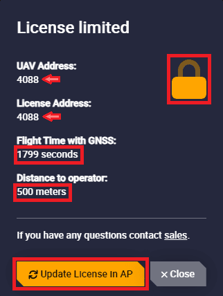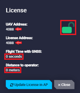 Clicking on the button "Update License in AP", if the users have the license activated, Veronte Ops will be updated and they will be able to operate without limitation.