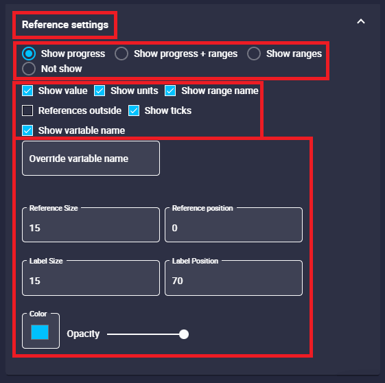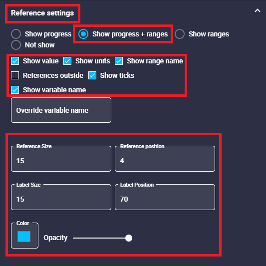- Show progress + ranges: Displays the progress arc of the selected variable in the gauge together with the previously defined ranges.
