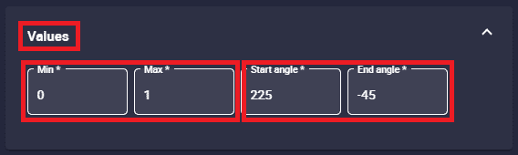 - Start/End angle: Start and end angle of the position of the minimum and maximum values respectively.